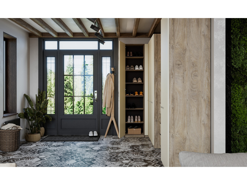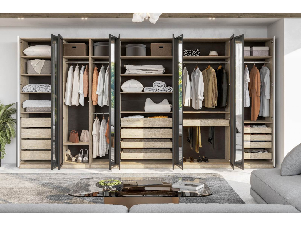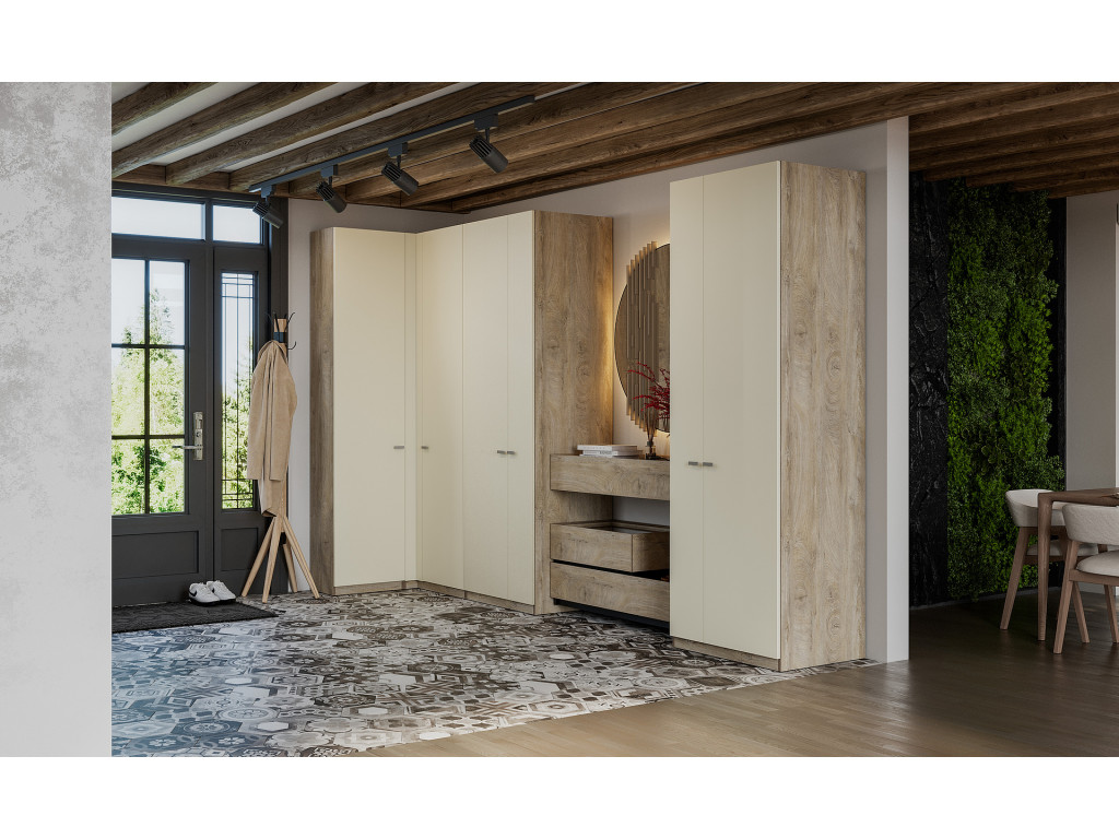Гардеробная система Этна – это уникальная серия, включающая корпуса, распашные фасады и разнообразное наполнение (ящики, полки, штанги, выкатные брючницы). Вы сможете организовать продуманное хранение одежды и вещей в любом помещении, от прихожей до рабочего кабинета, с учетом его размера и Ваших запросов. Трендовый декор фасадов «Алебастр» гармонично дополняет сложный древесный декор корпуса «дуб эндгрейн».