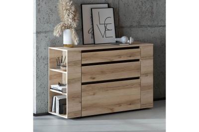 Уникальный комод с тремя выкатными ящиками разной высоты, позволяющими хранить вещи разных габаритов, с фасадной части по вертикальным краям декорирован массивными фальш-панелями, за которыми скрыты торцевые стеллажи с открытым полочным пространством.