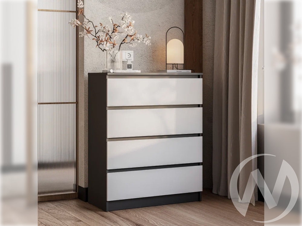 Особенности: Максимальная нагрузка на ящик - 5 кг. Крепление к стене - уголок овербаланс. Кромка корпус - 0,4х19 графит; кромка фасад - 0,4х19, 0,4х26 белая.