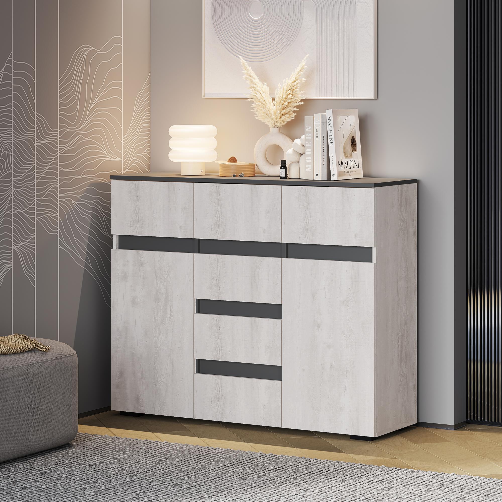 Коллекция «Мрия» — это органичное сочетание классических и современных элементов в дизайне мебели. Оттенки «бетон пайн светлый» и «графит» создают красивый контраст, который привнесет гармонию в интерьер. Однотонные горизонтальные геометрические вставки придают многослойность коллекции.
