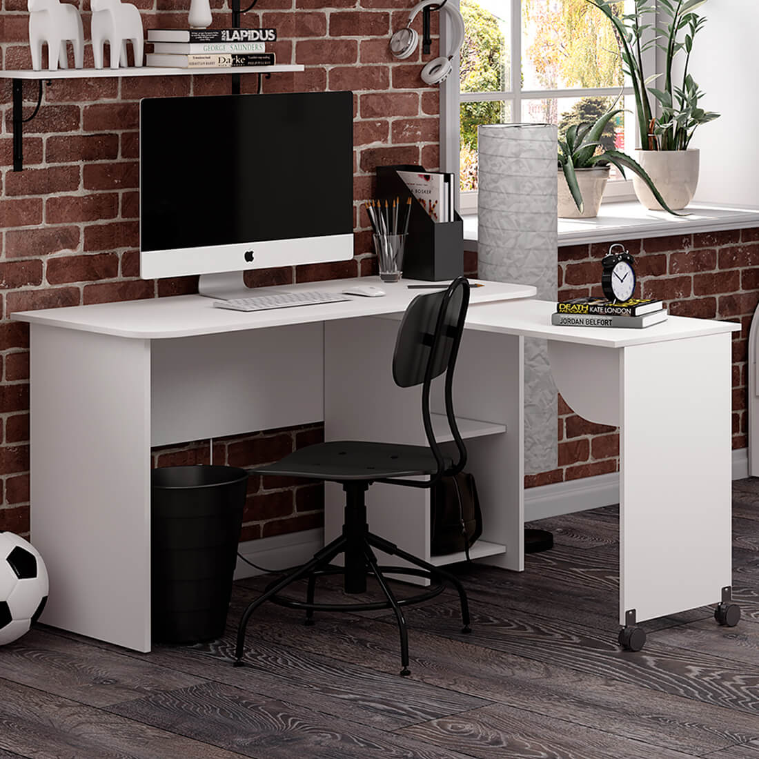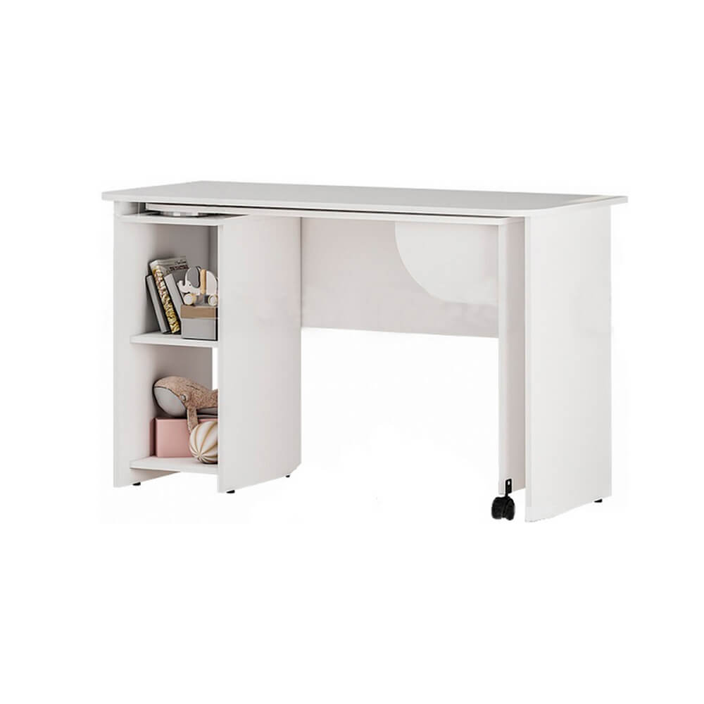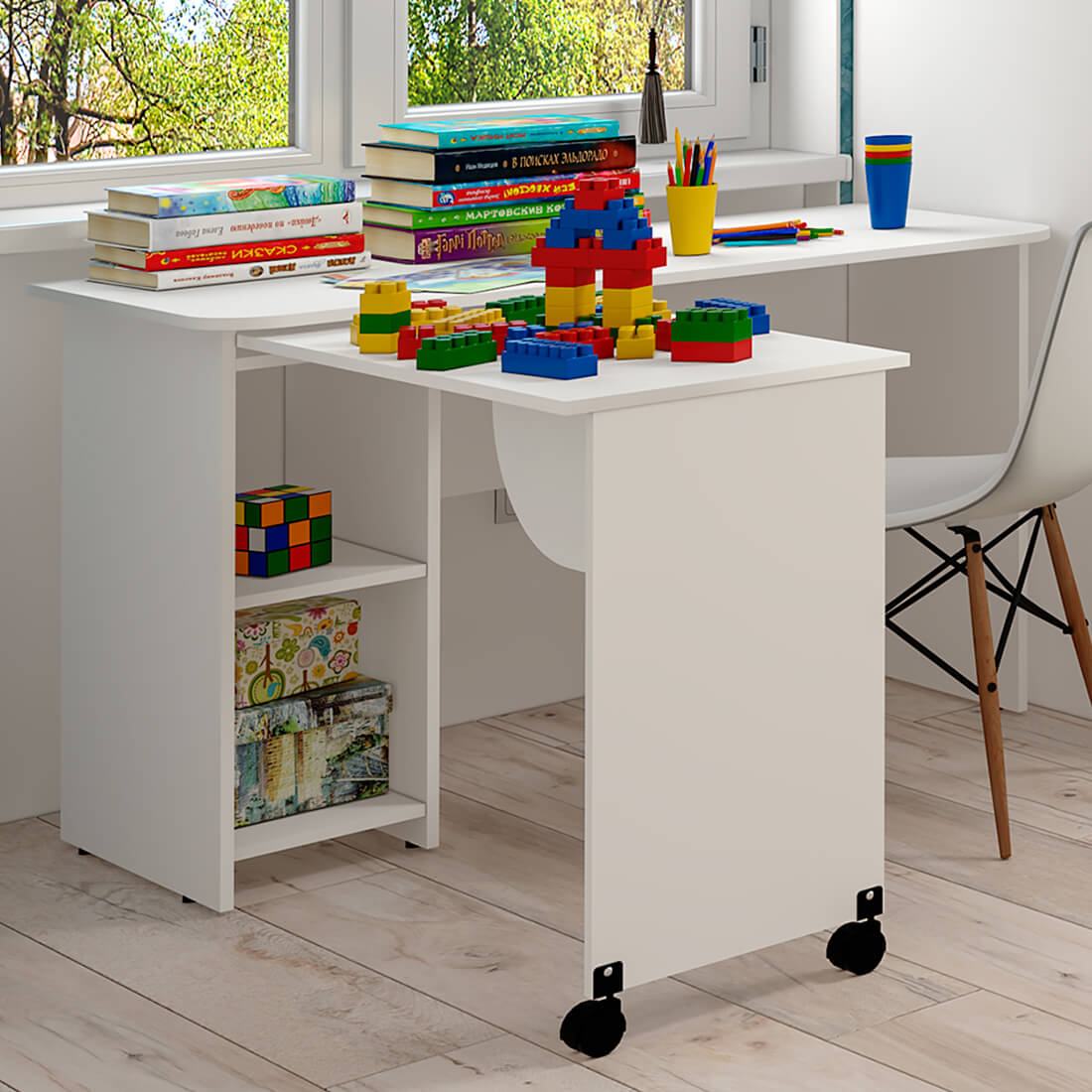 Очень практичная модель подойдет как для детской комнаты, так и для кабинета или офиса. Особенностью стола является раздвижная столешница, которая создает дополнительную рабочую поверхность. В двух открытых нишах можно хранить необходимые предметы или канцелярию. Белый цвет изделия позволит ему расположиться в любом интерьере.