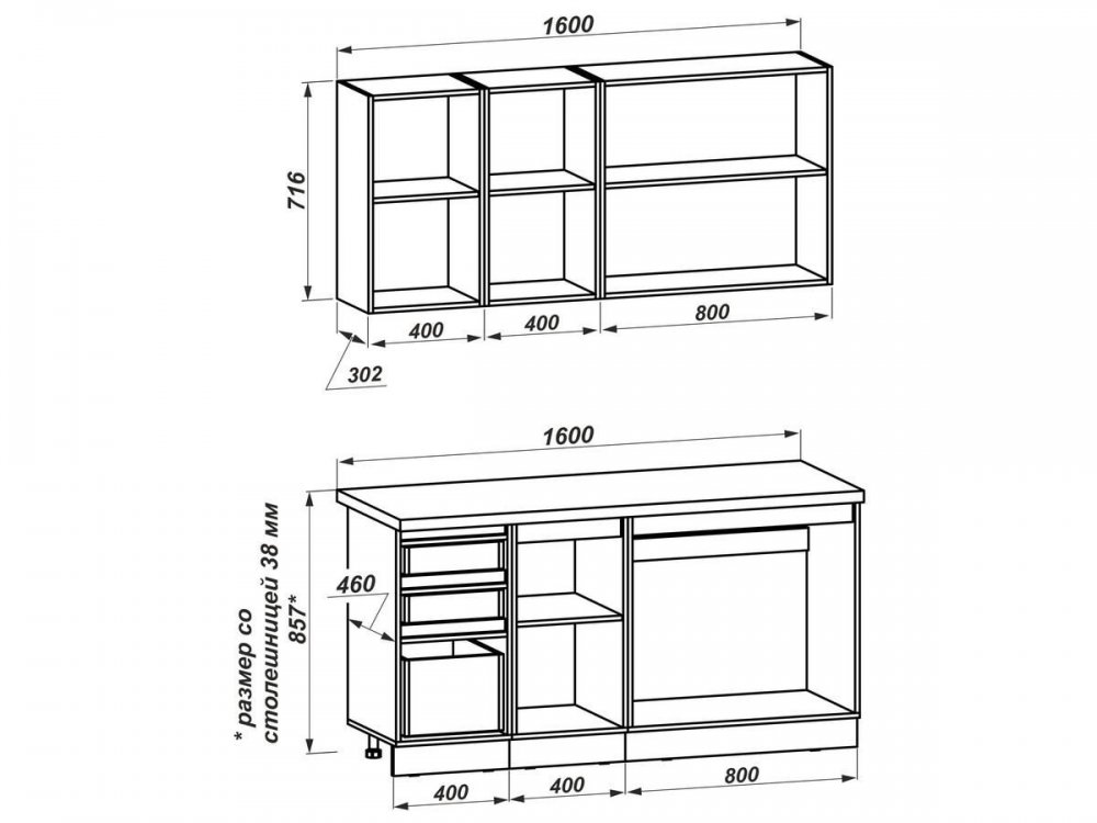 Столешница: 38 мм цельная 1600 цвета на выбор (из наличия) – Гранит Белый, Дуб Классический.