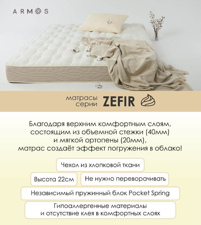 Матрас ZEFIR создает эффект погружения в облако! Серия ZEFIR - это три матраса разной жёсткости, матрас ZEFIR Hard - самый жёсткий матрас линейки. Чехол матраса ZEFIR выполнен из натуральной хлопковой ткани в нежных оттенках: «сливочная ваниль» в верхней части чехла и трендовая «клетка» на боковых поверхностях. В результате рождается очень «зефирная», пышная спальная поверхность!