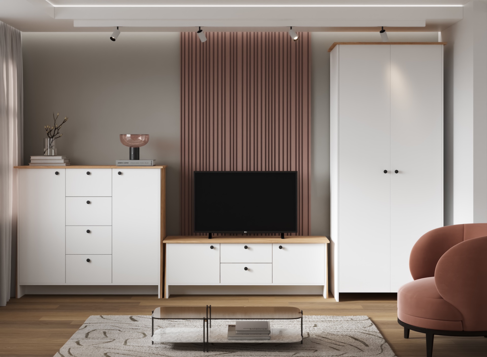 Гостиная Теодора - современная модульная система для стильного и удобного интерьера. Наши шкафы предлагают максимальное наполнение и удобство сборки. Боковые части изделий делают интерьер эстетичным, а шариковые направляющие ящиков обеспечивают комфорт использования. Выбирайте из двух цветовых вариантов и создавайте пространство по своему вкусу.
