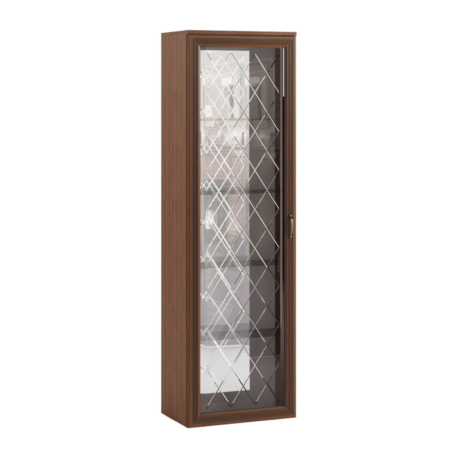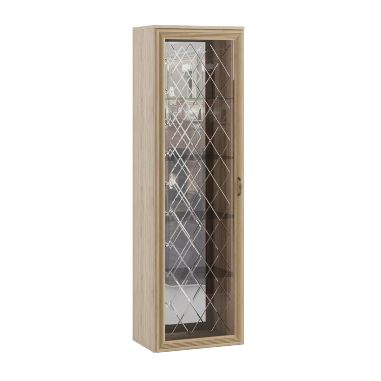 Пенал-витрина (надстраиваемый) размещается на тумбе для ТВ-техники, гармонично вписывается в интерьер и значительно облагораживает весь облик комнаты, в которой находится. Стекло с глубоким фацетом и гравированным геометрическим декором надежно защищает содержимое шкафчика от пыли, случайных и неловких движений членов семьи и внезапных падений. Все сувениры и бокалы на стеклянных полках витрины останутся в сохранности. Зеркало на внутренней стенке модуля покрыто специальной защитной пленкой, которая в случае повреждения стекла сохранит каждый его кусочек. Фасад можно повесить как на левую, так и на правую сторону в зависимости от выбранного расположения в компоновке.