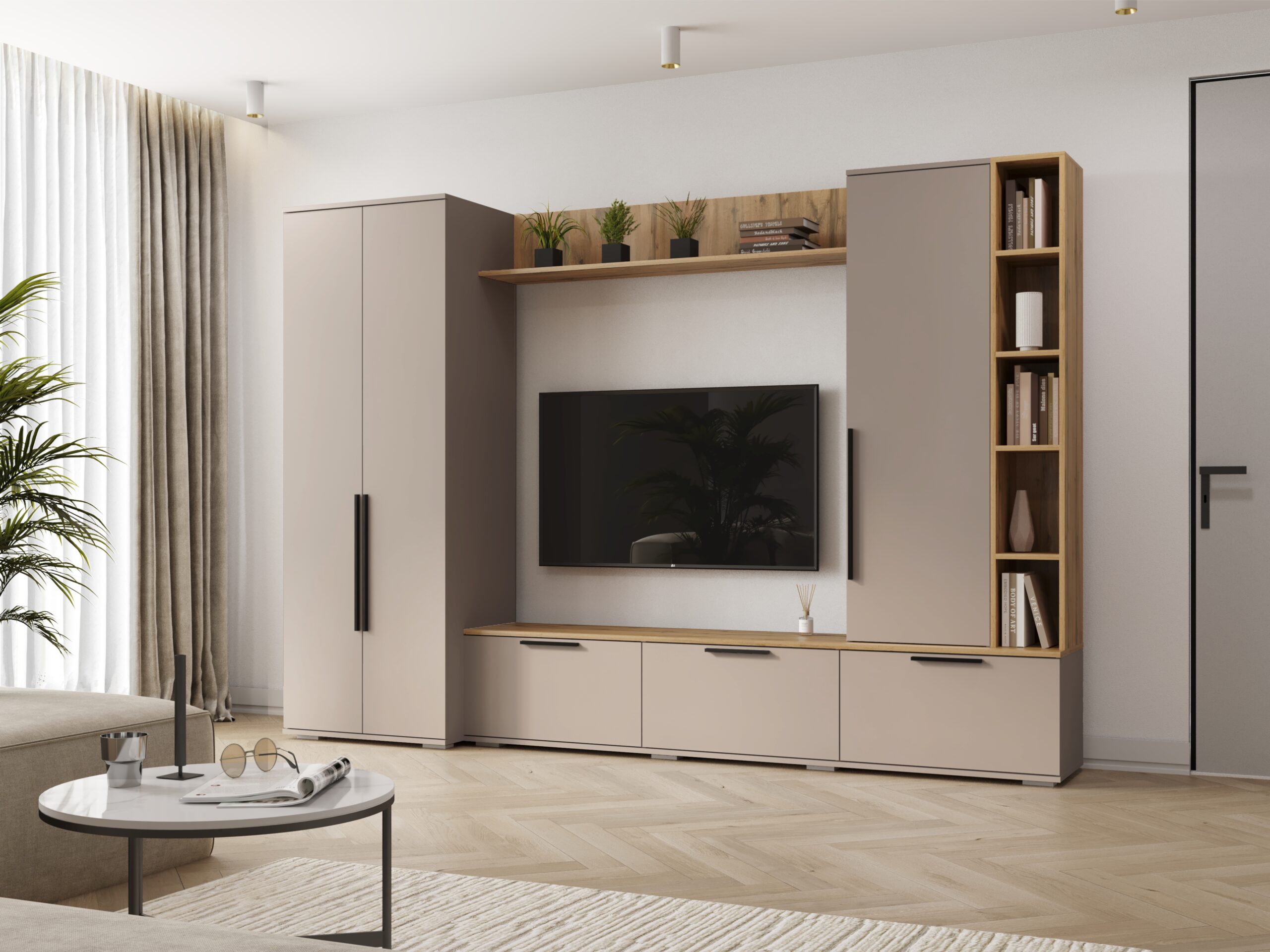 Модульная гостиная Селеста в минималистичном дизайне и спокойных цветах универсально впишется в дизайн любой гостиной. В гостиной предусмотрено множество мест для хранения вещей, предметов интерьера и одежды.