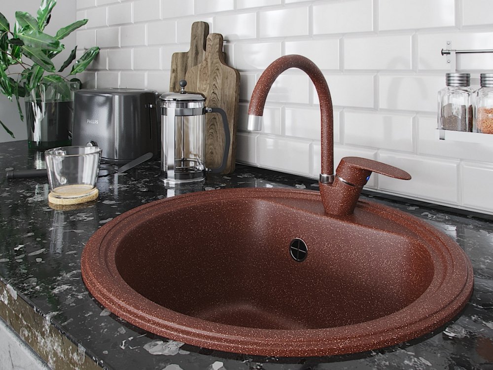 Диаметр чаши 430*400 мм Материал: 80% мраморной крошки, 20% сложносоставные связующие смолы и гелькоут. В комплект мойки входит сифон с переливом пр-во Россия.