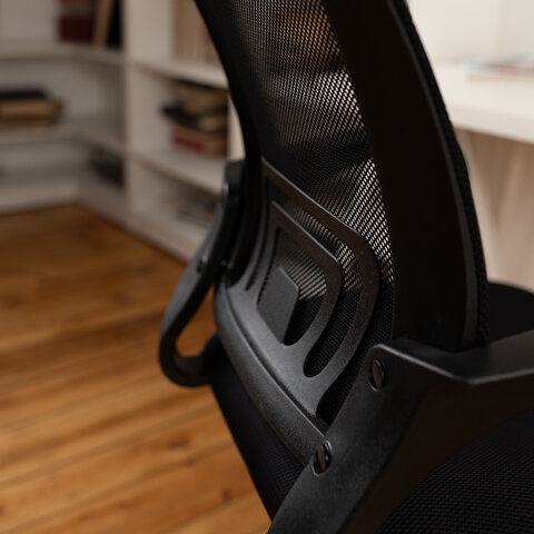 Спинка выполнена из прочного материала – акриловой сетки и имеет выраженную поясничную поддержку, обеспечивающую комфортную посадку в течение всего рабочего дня.