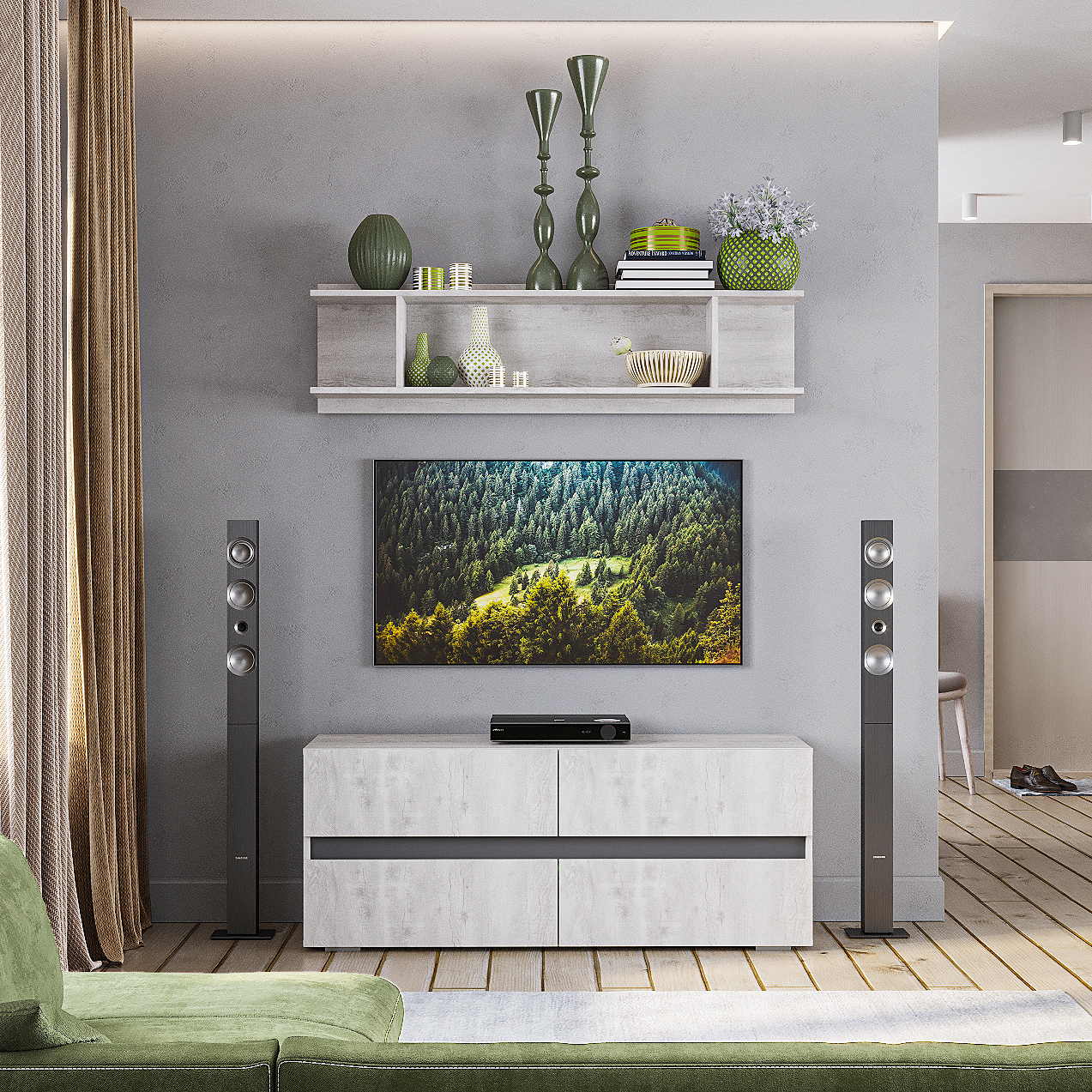 Коллекция «Мрия» — это органичное сочетание классических и современных элементов в дизайне мебели. Оттенки «бетон пайн светлый» и «графит» создают красивый контраст, который привнесет гармонию в интерьер. Однотонные горизонтальные геометрические вставки придают многослойность коллекции.