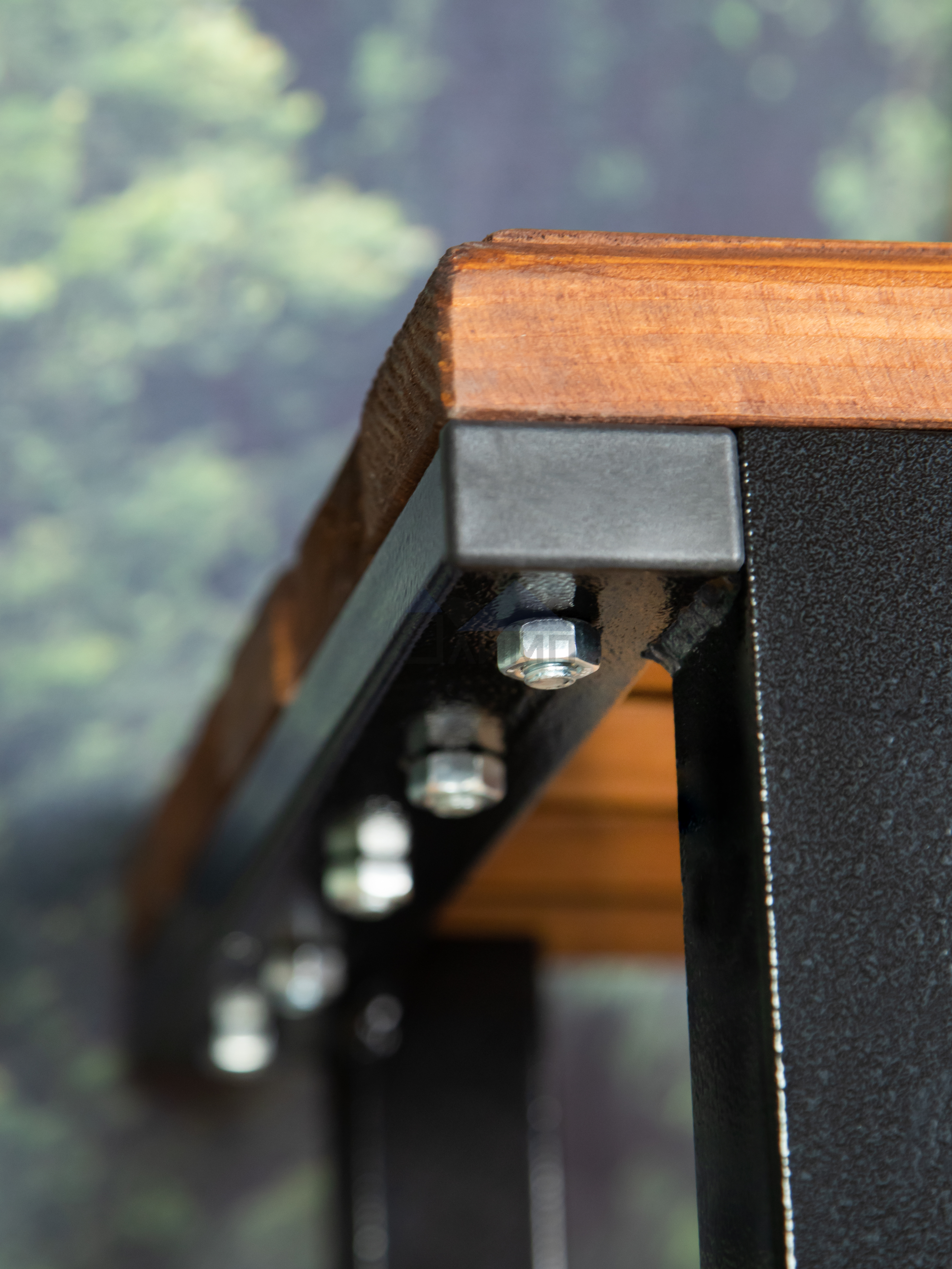 Бруски толщиной 32мм изготовлены из сосны и покрыты морилкой и лаком.