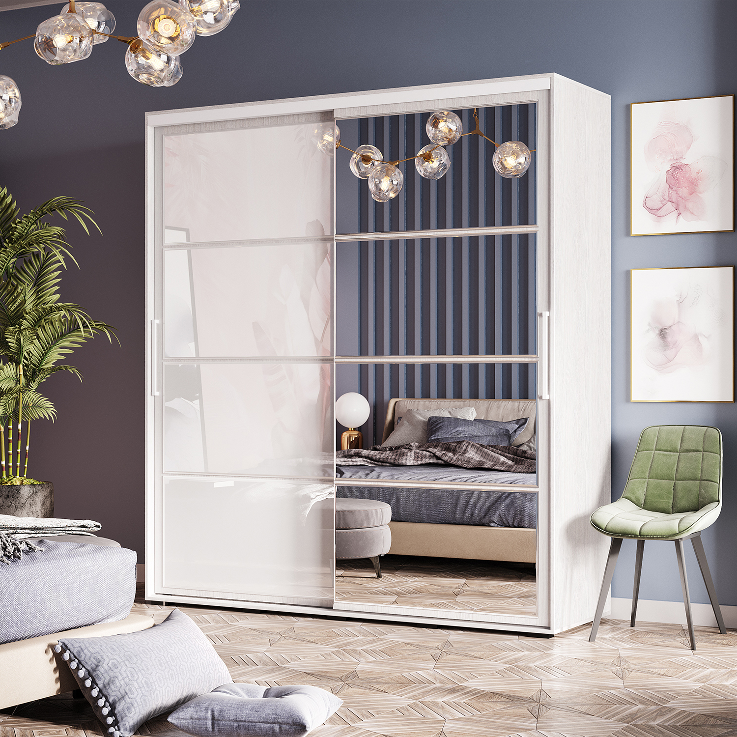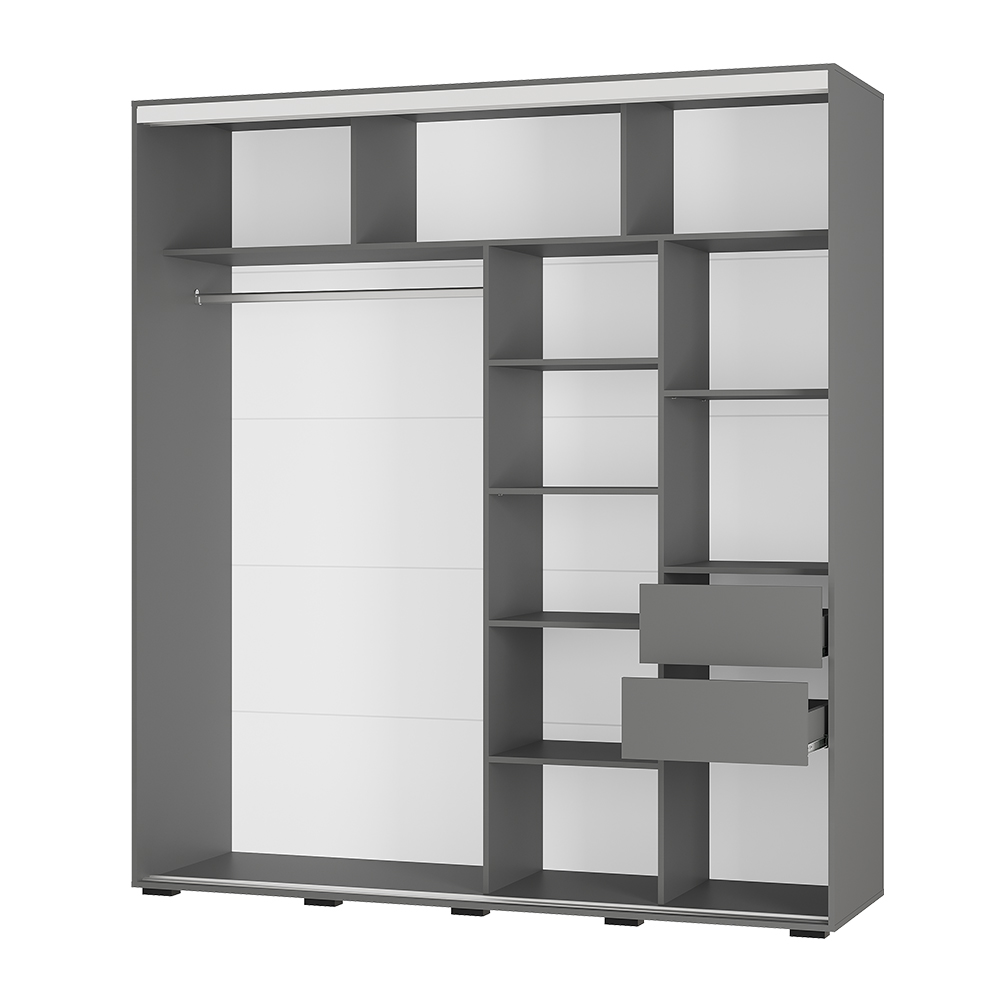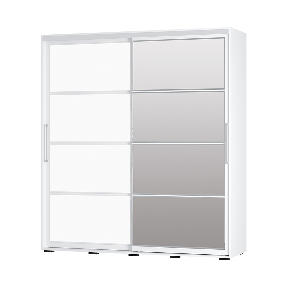 модель изготовлена из ЛДСП, одна раздвижная створка выполнена из темного стекла, а вторая – зеркальная,