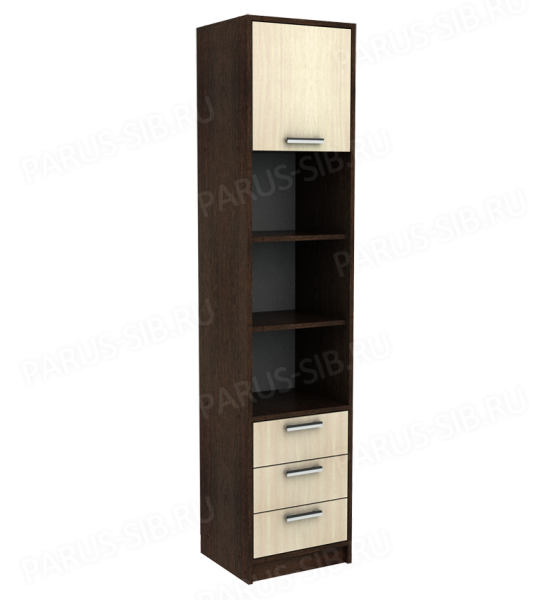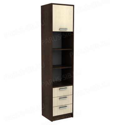 Пенал с тремя выдвижными ящиками и открытыми полками отличается простотой и функциональностью. За закрытой дверцей достаточное место для хранения, что делает пенал очень вместительным. Небольшие размеры пенала позволят разместить его даже в небольших помещениях.