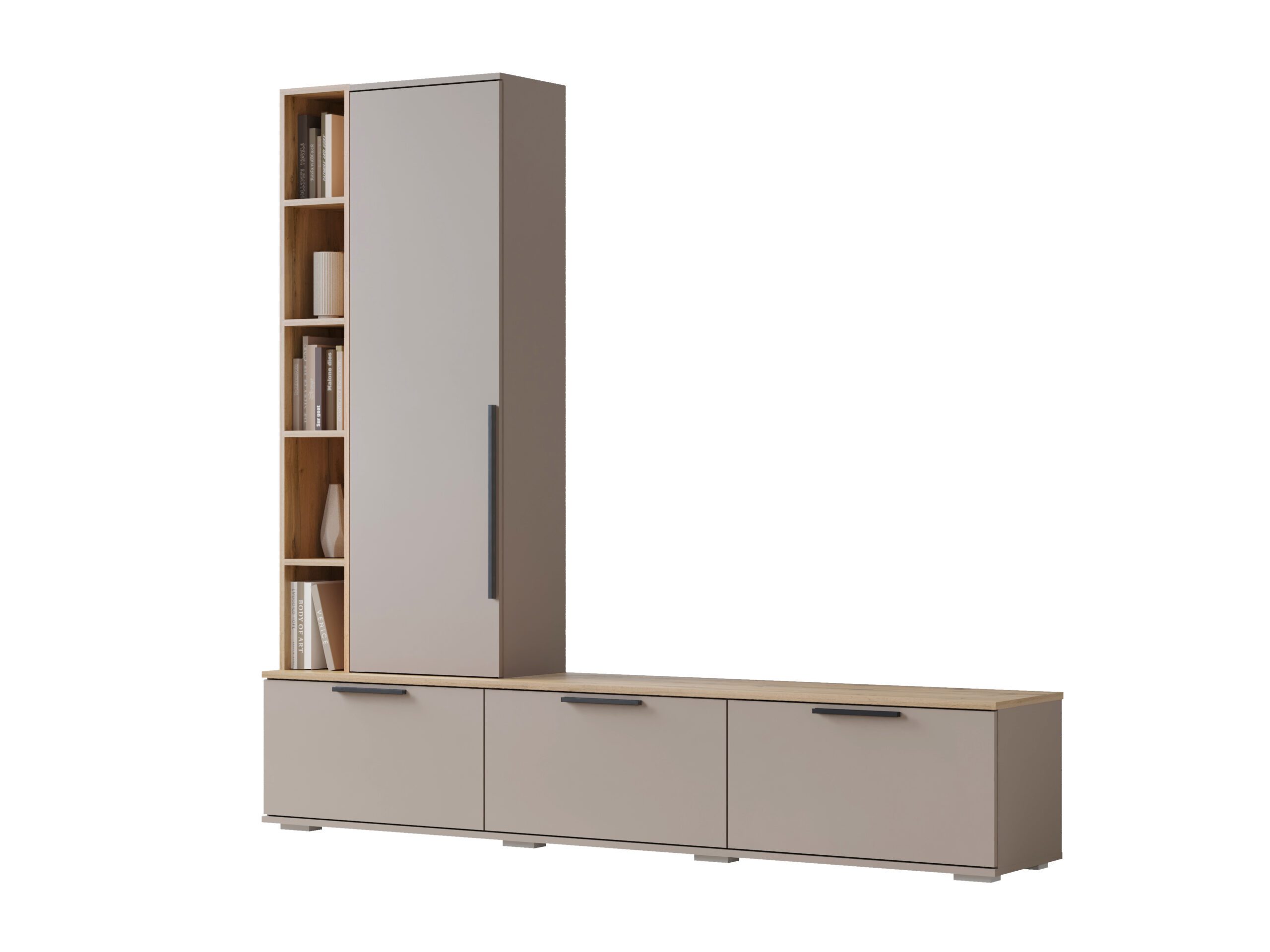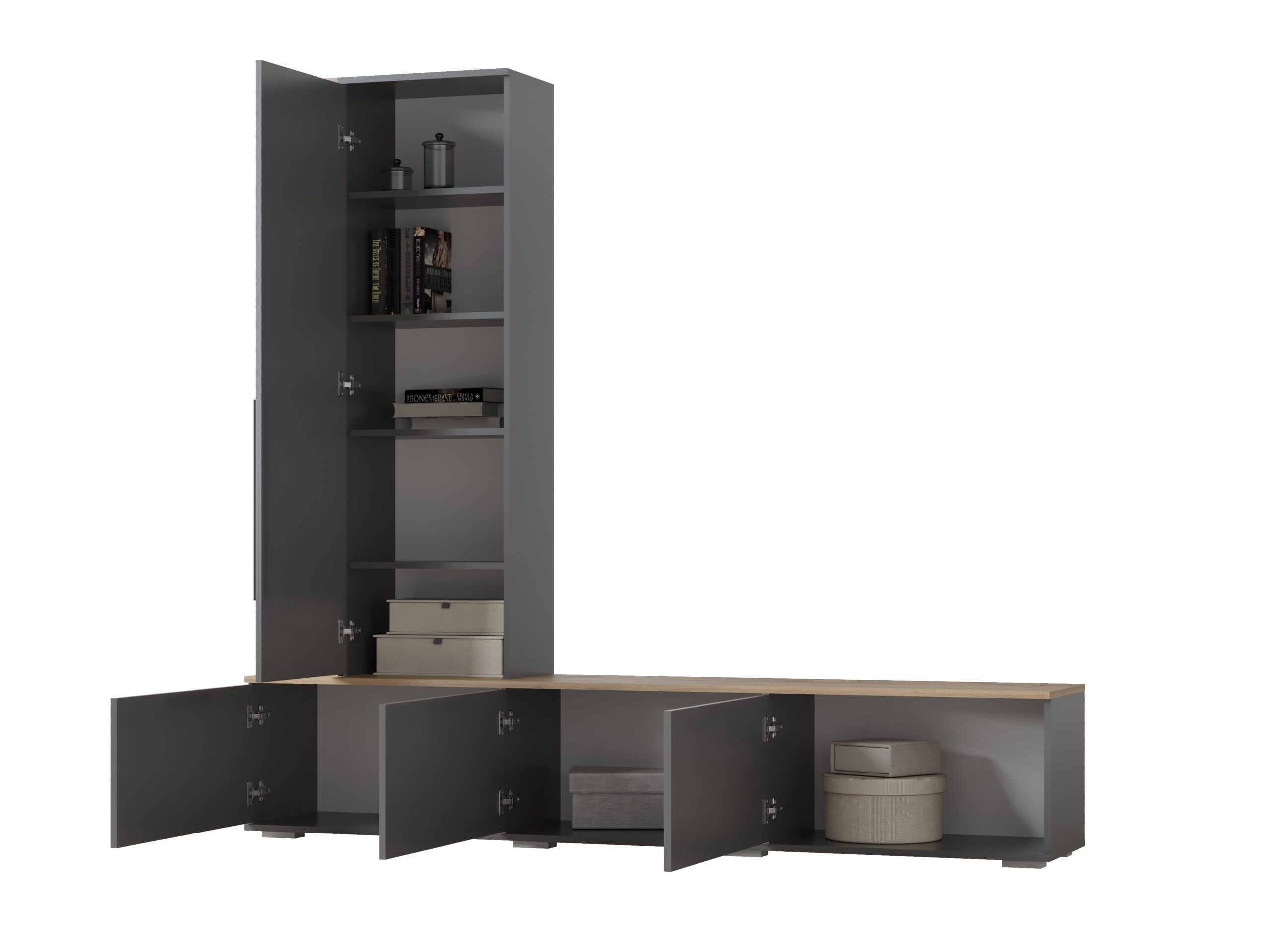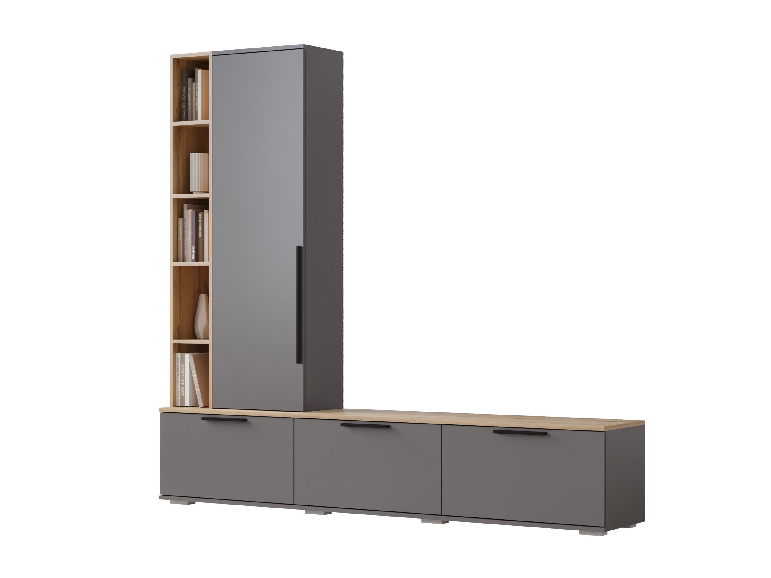 Шкаф для одежды со штангой позаботиться о вещах, в тумбе удобно разместить книги, в шкафу-пенале одежду на полках, а на открытых полках — предметы интерьера или любимые фотографии.