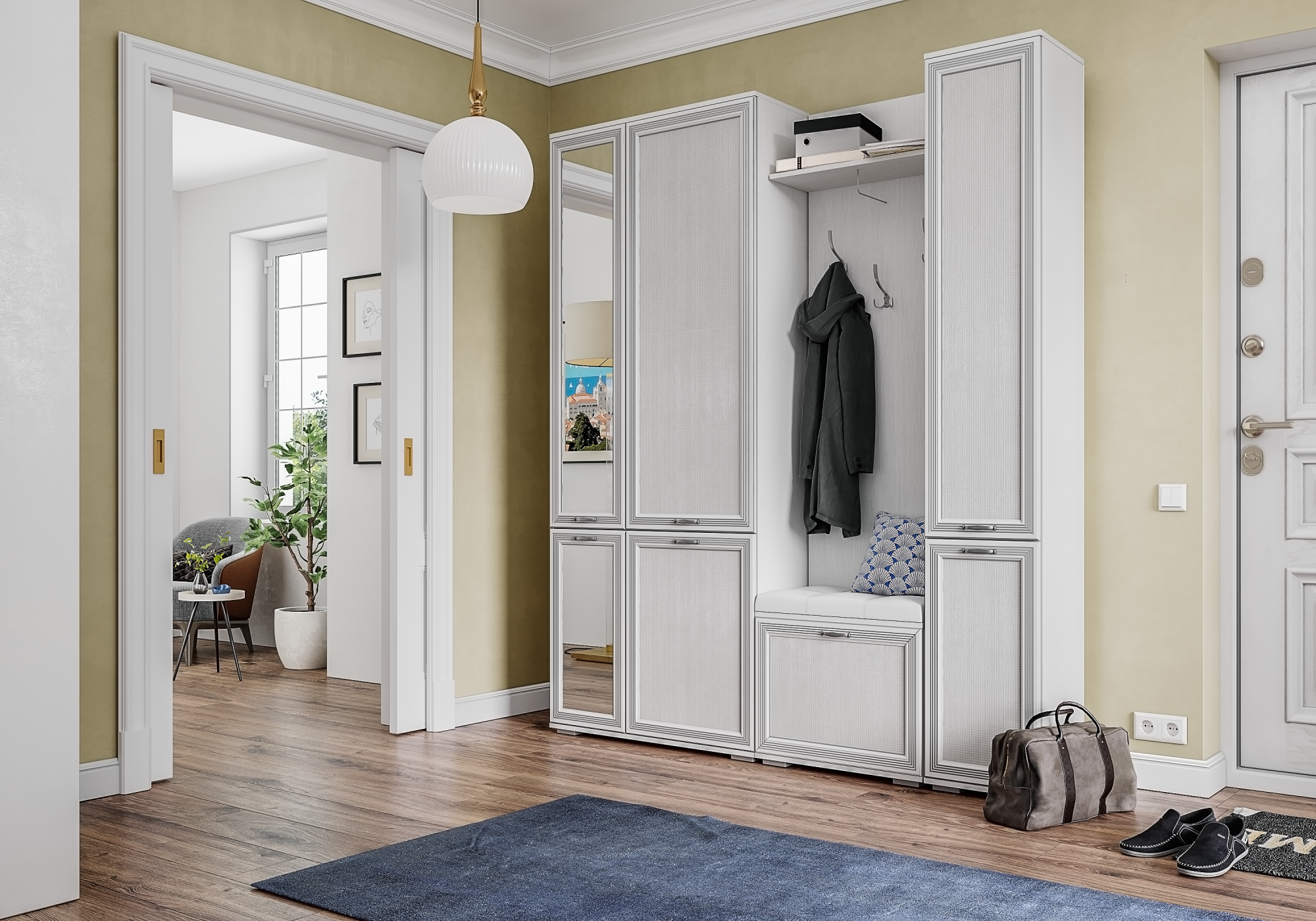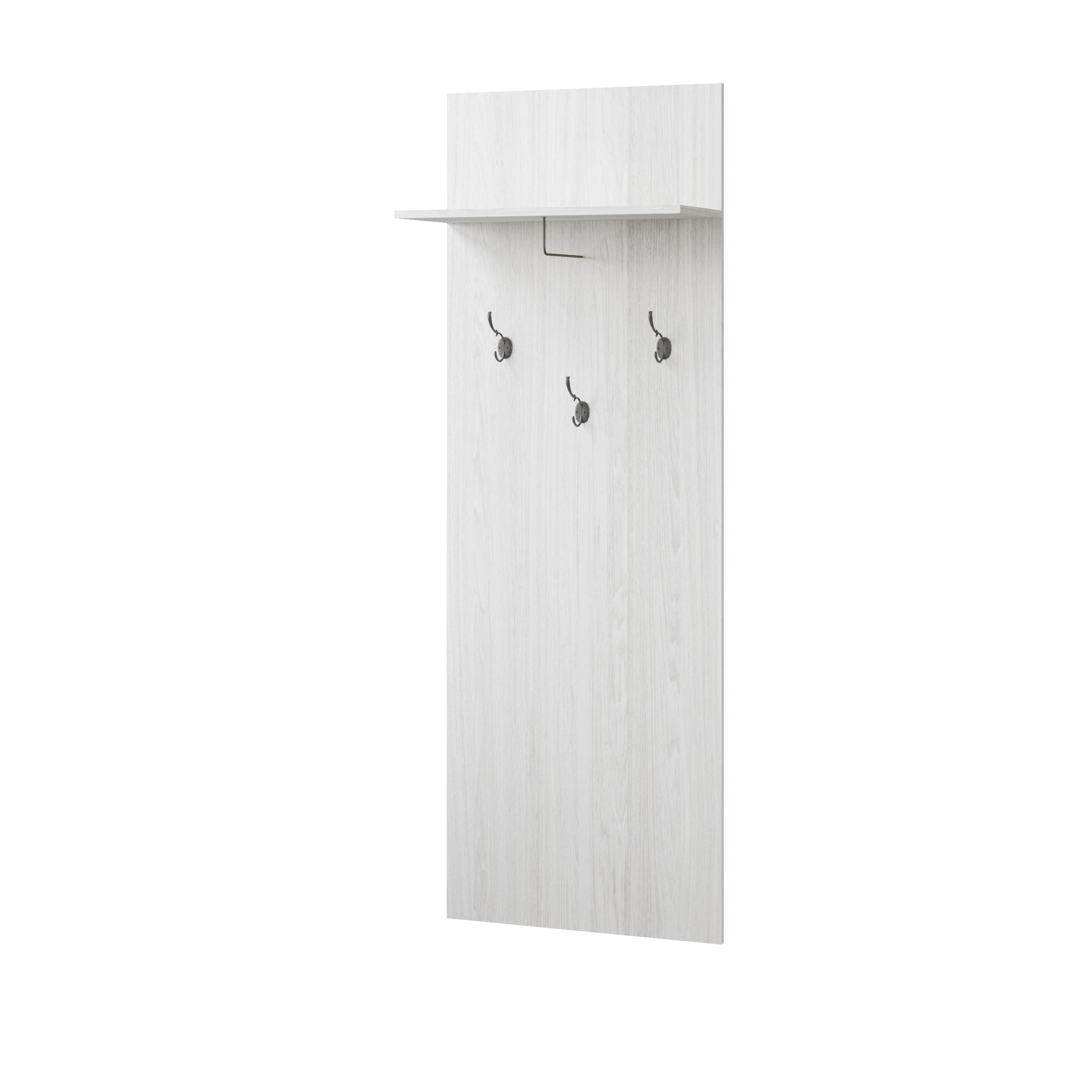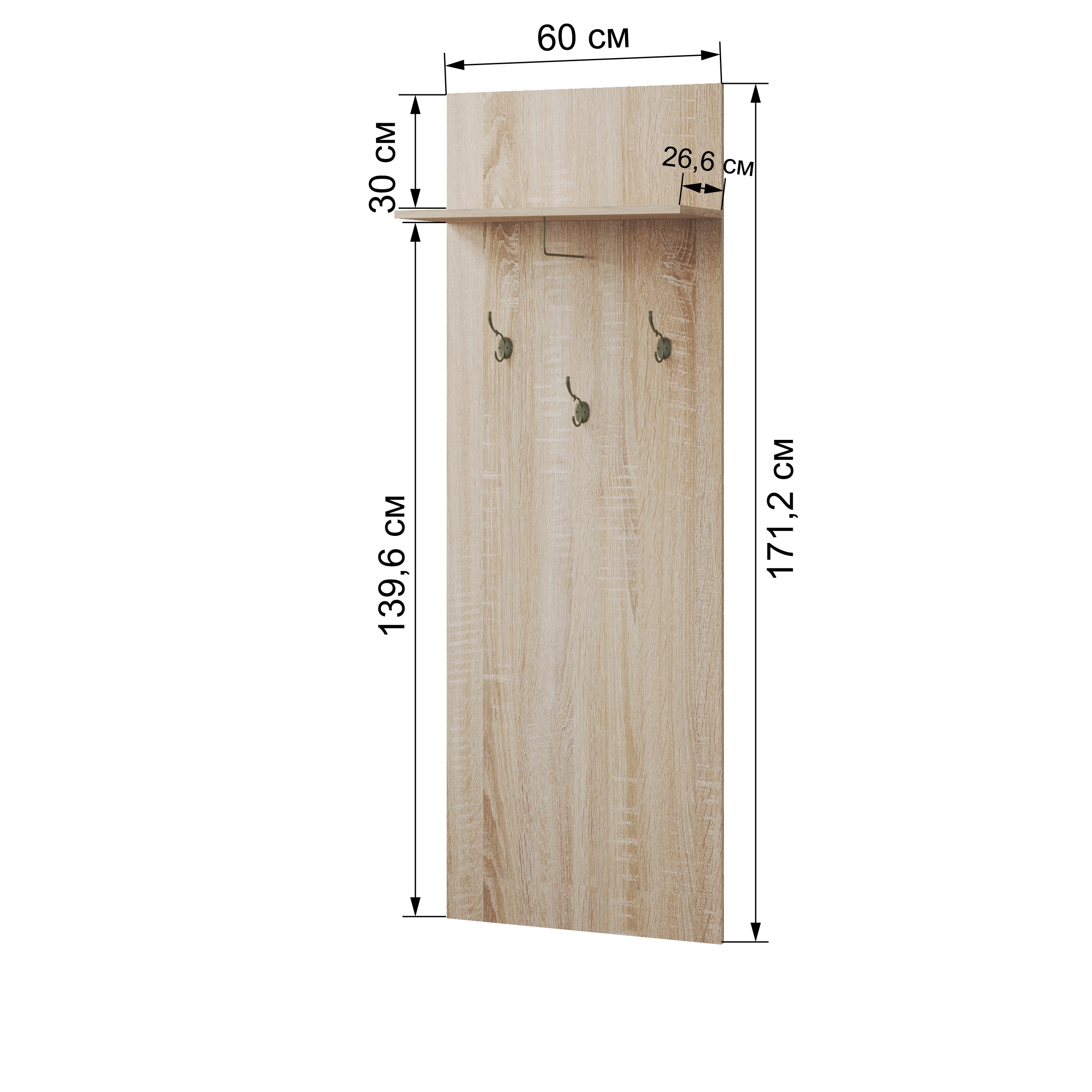 Навесная вешалка в прихожую шириной 600 мм с горизонтальными полкой для хранения головных уборов. Металлические крючки под старину в количестве 3 штук крепятся в заранее заготовленные отверстия на разной высоте. Вешалка уместно дополняет компоновку вместе с тумбой ЛТ-30 и сиденьем мягким ЛС-30.